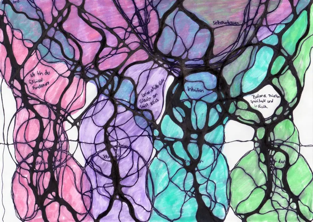 Es ist ein lebendiges Kunstwerk, gezeichnet aus Linien, Formen und Farben, die Deine Geschichte erzählen. Abgerundete Linienkreuzungen symbolisieren Deine Erfolge, Deine Freude und das Vertrauen, das Dich führt. Doch Linien, die verworren sind und Ecken ergeben spiegeln die Herausforderungen und Blockaden wider, die Dich manchmal festhalten und Deine Energie absaugen. Wenn wir alle Ecken und Kanten auf dem Papier abrunden, geschieht dies auch in unserem Denken, Fühlen und Handeln.